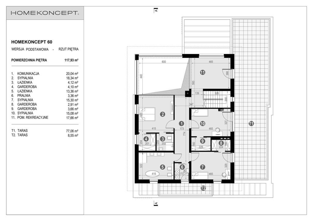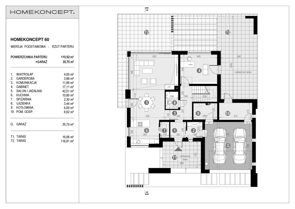 HOMEKONCEPT 60 cechują zaprojektowane w przemyślany sposób, funkcjonalne i dające mieszkańcom szerokie możliwości aranżacyjne wnętrza. Na parterze mieści się duża strefa dzienna, w której skład wchodzi: duży salon z wyjściem na taras, słoneczna jadalnia i otwarta kuchnia z praktyczną spiżarnią. Antresola nad salonem w połączeniu z dwukondygnacyjnymi przeszkleniami niesamowicie uatrakcyjnia wnętrze, dodając mu uroku, przestronności i nowoczesności. Na parterze domownicy znajdą także przytulny gabinet z wyjściem na taras. W zależności od potrzeb, z łatwością można zaaranżować go także jako pokój gościnny lub dodatkową sypialnię. Przestrzeń parteru projektu willi HOMEKONCEPT 60 dopełnia część gospodarczo-użytkowa: wiatrołap z garderobą, łazienka, dwustanowiskowy garaż, kotłownia oraz pomieszczenie gospodarcze. Piętro naszego nowoczesnego domu stanowi prywatną strefę domowników. Czekają tu na nich trzy komfortowe sypialnie (w tym apartament małżeński z własną łazienką, garderobą i widokiem na salon poprzez przeszkloną ścianę przy antresoli), przestronna łazienka z wanną i prysznicem, duża pralnia oraz pomieszczenie rekreacyjne. Pomieszczenie rekreacyjne można zaaranżować jako domową siłownię, pokój zabaw dla dzieci lub na przykład pokój telewizyjny czy domową bibliotekę. Dwie mniejsze sypialnie również posiadają prywatne garderoby. Na piętrze domu znajdują się dwa piękne tarasy dostępne z kilku pomieszczeń.