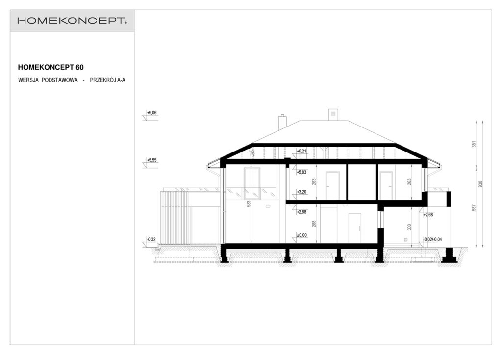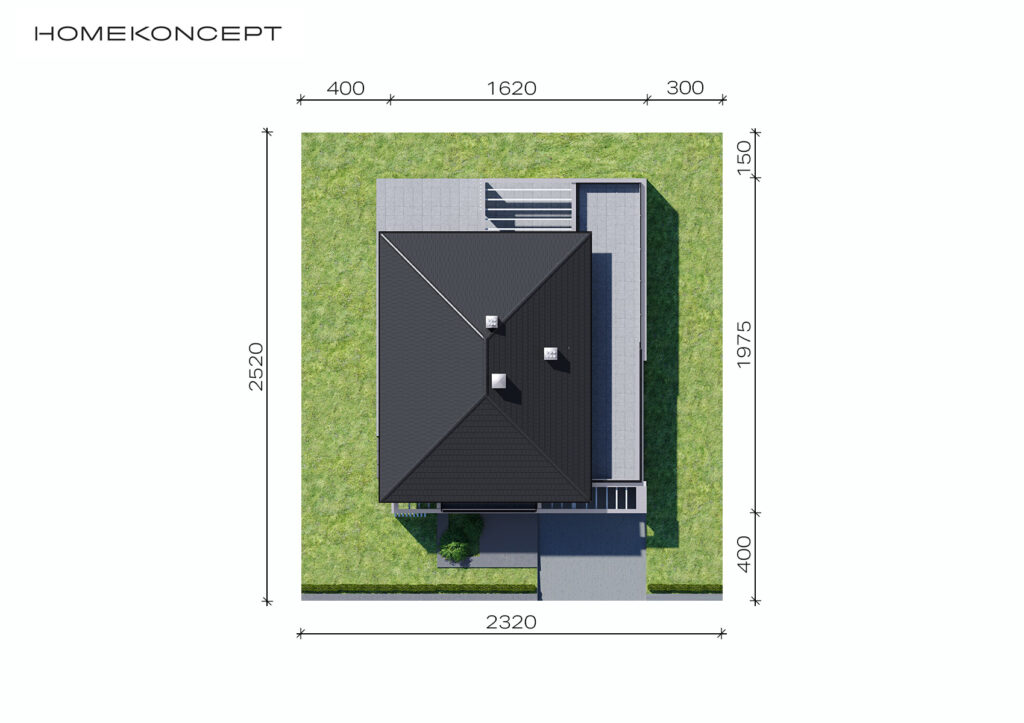 Gotowy projekt luksusowej rezydencji HOMEKONCEPT 60 to prostokątna bryła z garażem wysuniętym przed lico budynku. Dom przyciąga wzrok nowoczesną elewacją skomponowaną z dwubarwnego tynku, która harmonizuje z antracytową dachówką oraz ciemną stolarką okienną i drzwiową. Tym samym dom prezentuje się elegancko i niezwykle współcześnie. Otaczające całość typowe dla HOMEKONCEPT białe belkowanie przepięknie uatrakcyjnia budynek, a dwukondygnacyjne duże przeszklenia dodają mu ponadczasowego charakteru. Przeszklenia te dodatkowo perfekcyjnie doświetlają wnętrze dziennym światłem i gwarantują fenomenalny widok na najbliższą okolicę. Miłośnikom przydomowej zieleni z pewnością przypadnie do gustu przestronny taras, będący naturalnym przedłużeniem strefy dziennej. Częściowo zadaszony i osłonięty nowoczesną pergolą, sprawdzi się idealnie jako rodzinna strefa relaksu lub jadalnia na świeżym powietrzu, również w niepogodę.