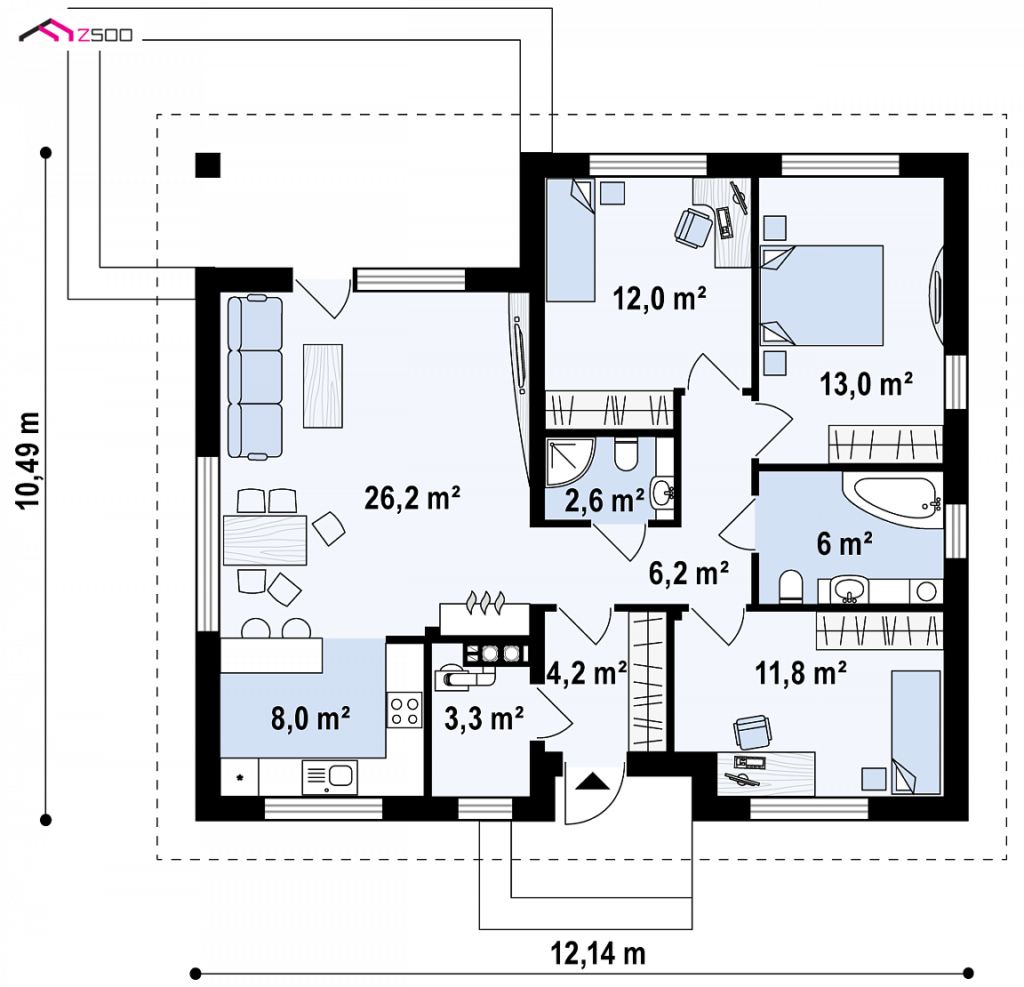 Parter 90,0 / 93,3 m² Sień 4,2 m² Łazienka 6,0 m² Kuchnia 8,0 m² Pokój 11,8 m² Pom. gosp. 3,3 m² Łazienka 2,6 m² Hol 6,2 m² Salon + jadalnia 26,2 m² Pokój 13,0 m² Pokój 12,0 m² - Item 2